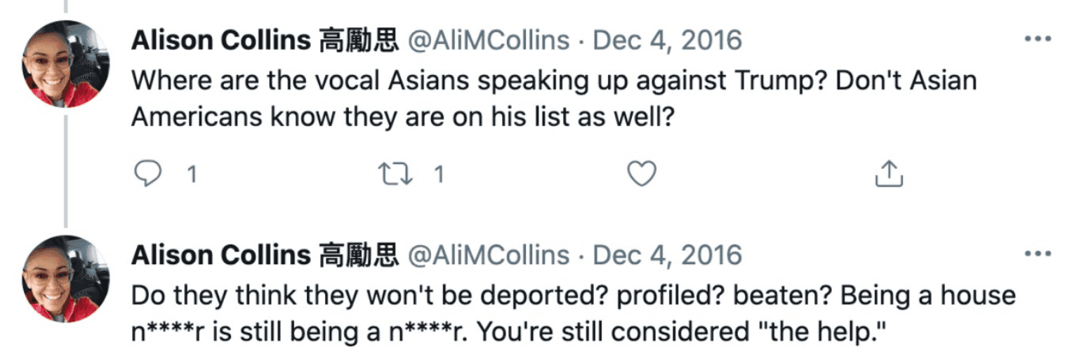Collins accused Asian Americans of using "white supremacist thinking" to "get ahead" and called Asian Americans "house n****rs" in a series of tweets that surfaced in March 2021.