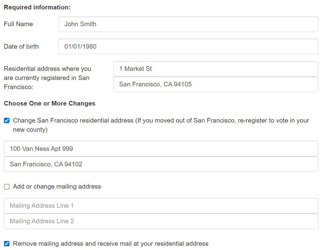 To update your voter registration, fill out the "Update Your Voter Registration Record" form from the SF Department of Elections. Only fill out the fields you want to update.
