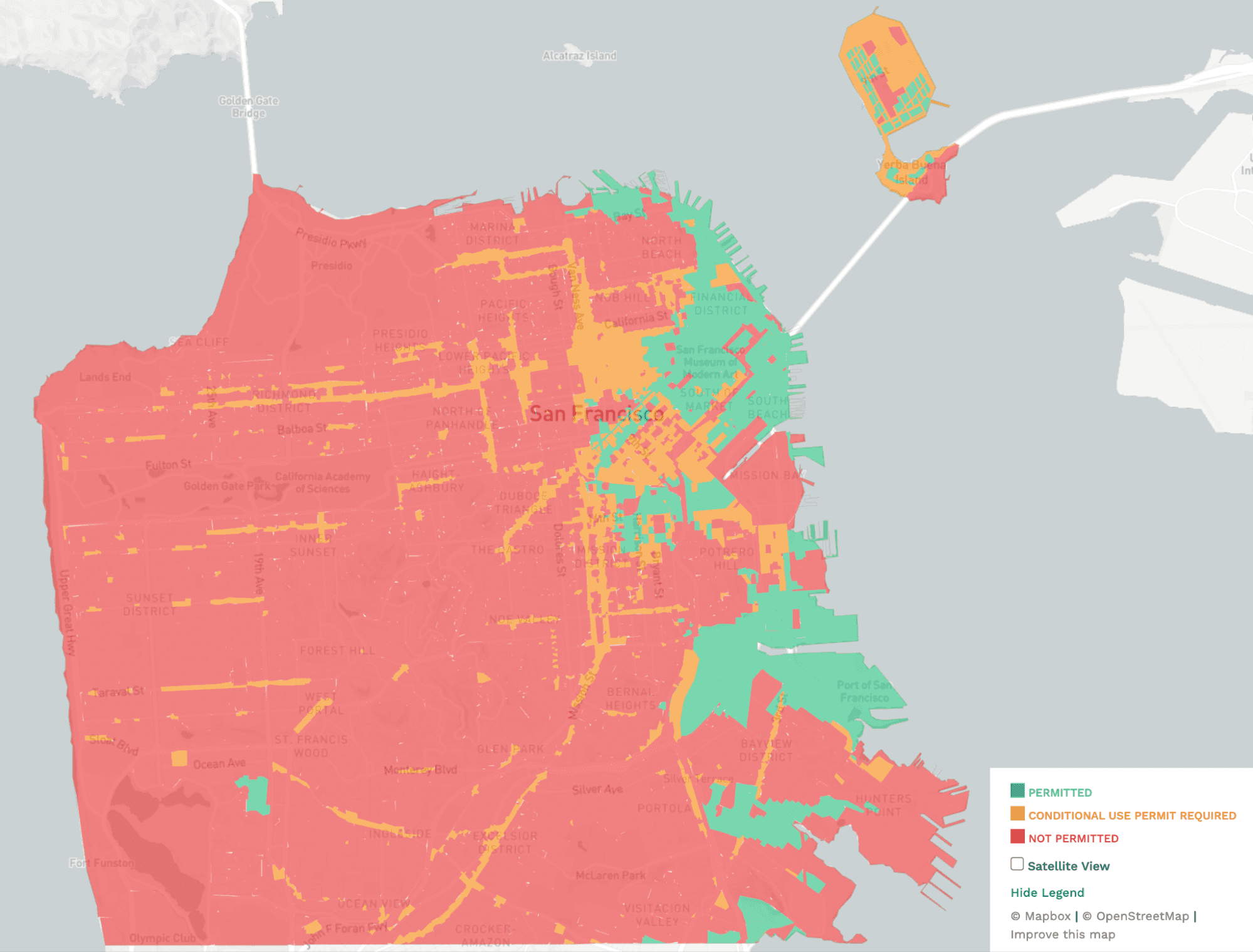 Besides residential areas, formula retail is outright banned in some commercial areas, too: several blocks of North Beach, Chinatown, and Hayes Valley.