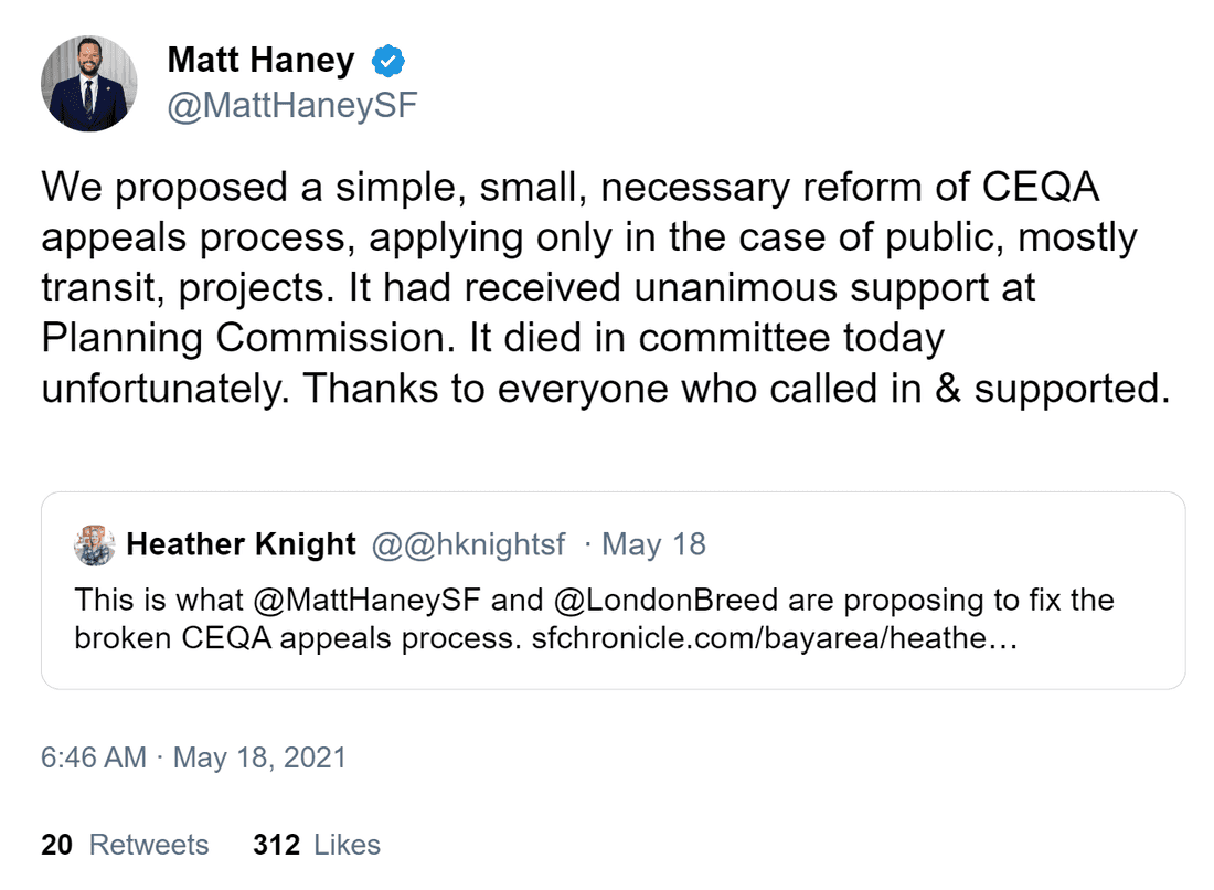 Matt Haney has also shown that he is an advocate for building more housing and reforming well-intentioned but backwards laws like CEQA. Most recently, he supported turning a valet parking lot into an apartment building while his fellow Supervisors opposed it.