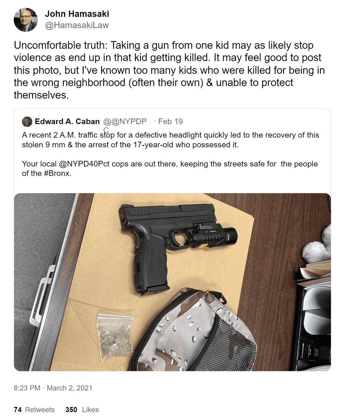 Among positions like supporting "defund the police", Hamasaki has also repeatedly advocated for young men to carry concealed weapons in dangerous neighborhoods: